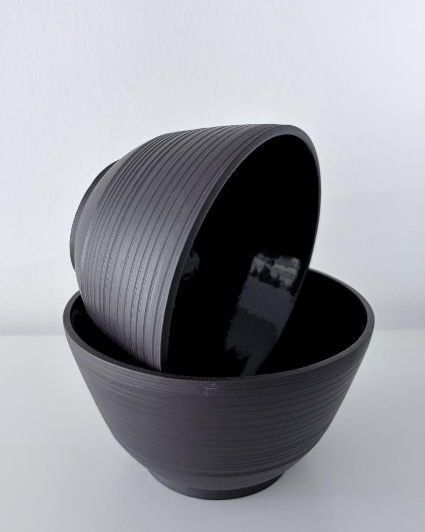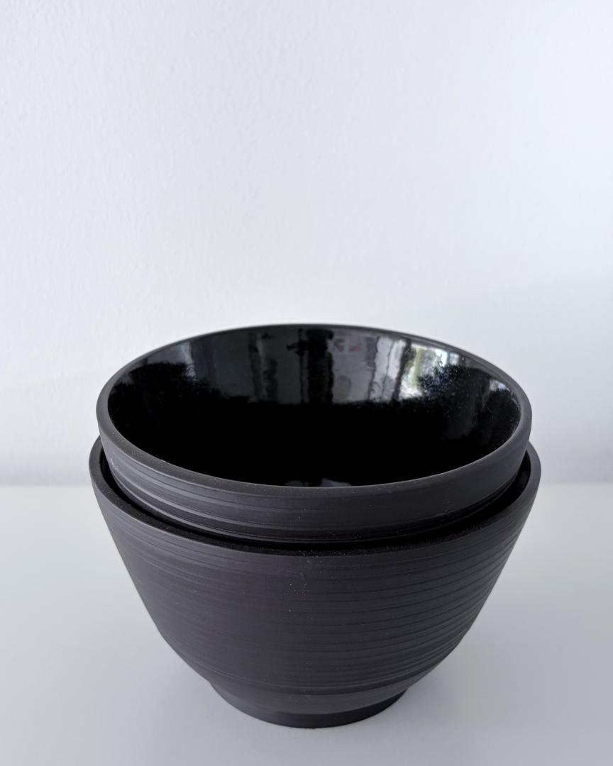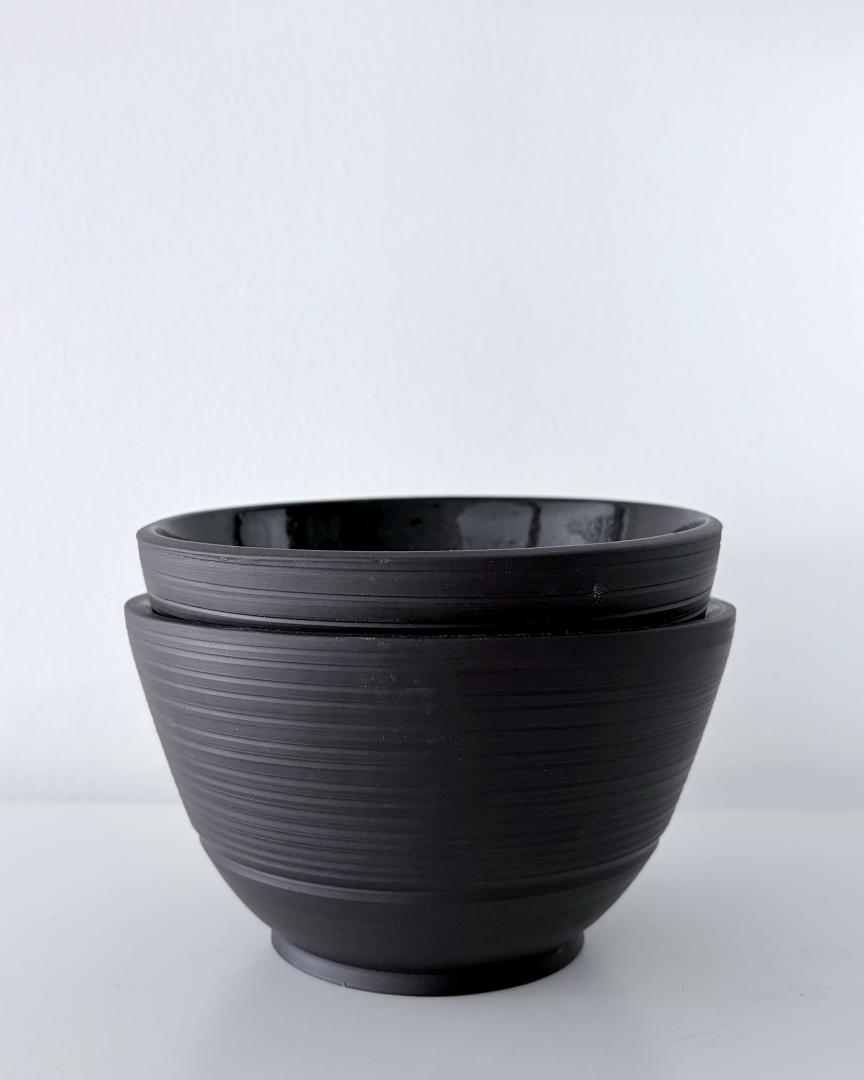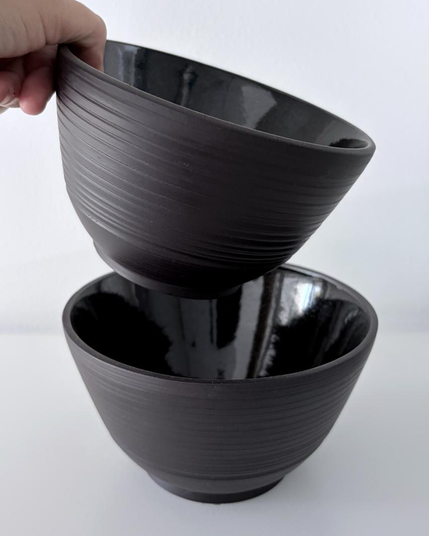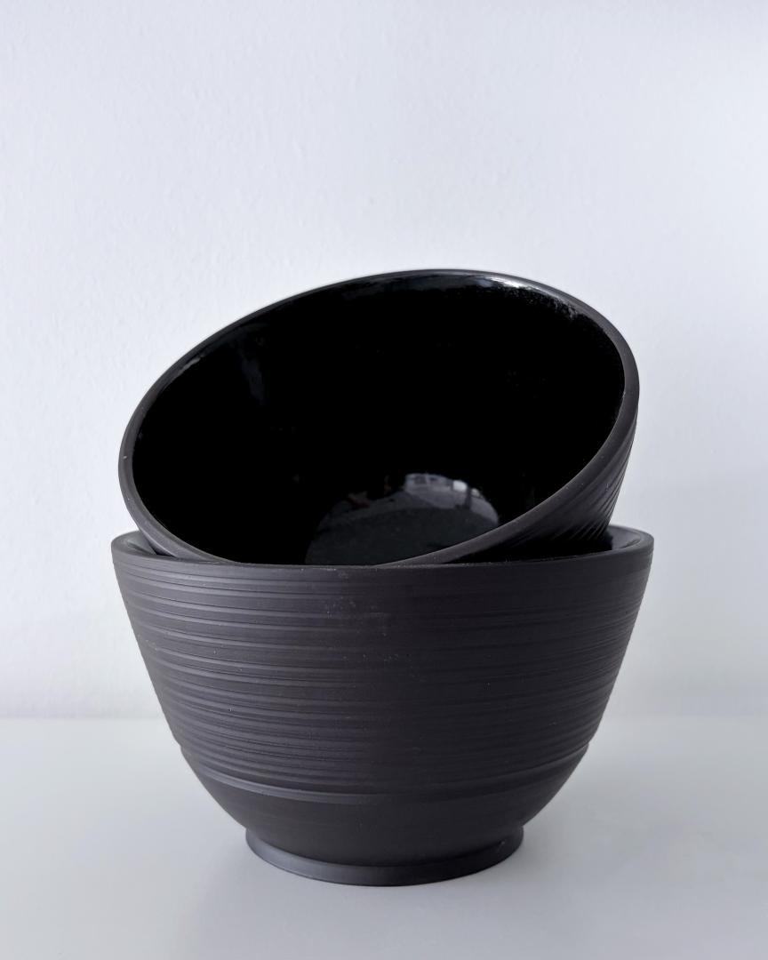 Set of 2 bowls – Bowl 1 height: 9cm / diameter: 7.8cm – Bowl 2 height: 8 cm / diameter: 5.4cm – Keane Black Mid Fire glazed online on the inside in glossy black. All the Beyaz Ceramics tablewares are food safe.