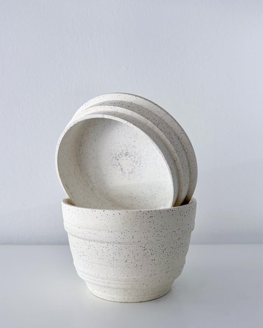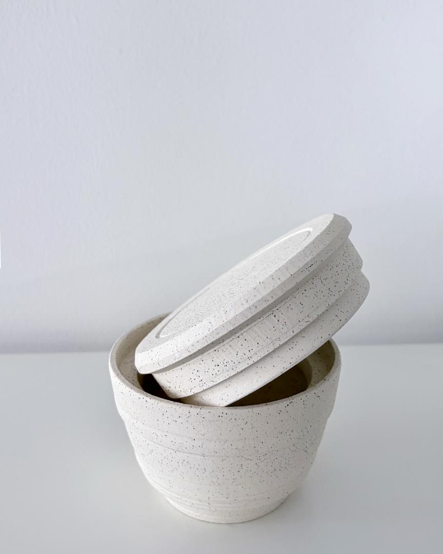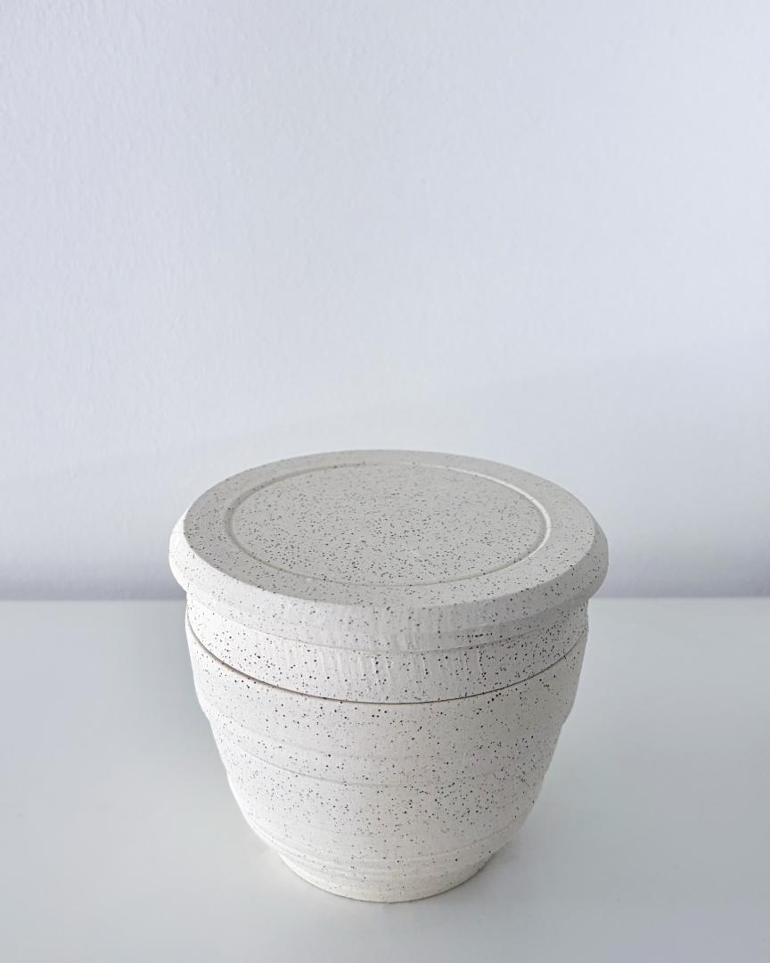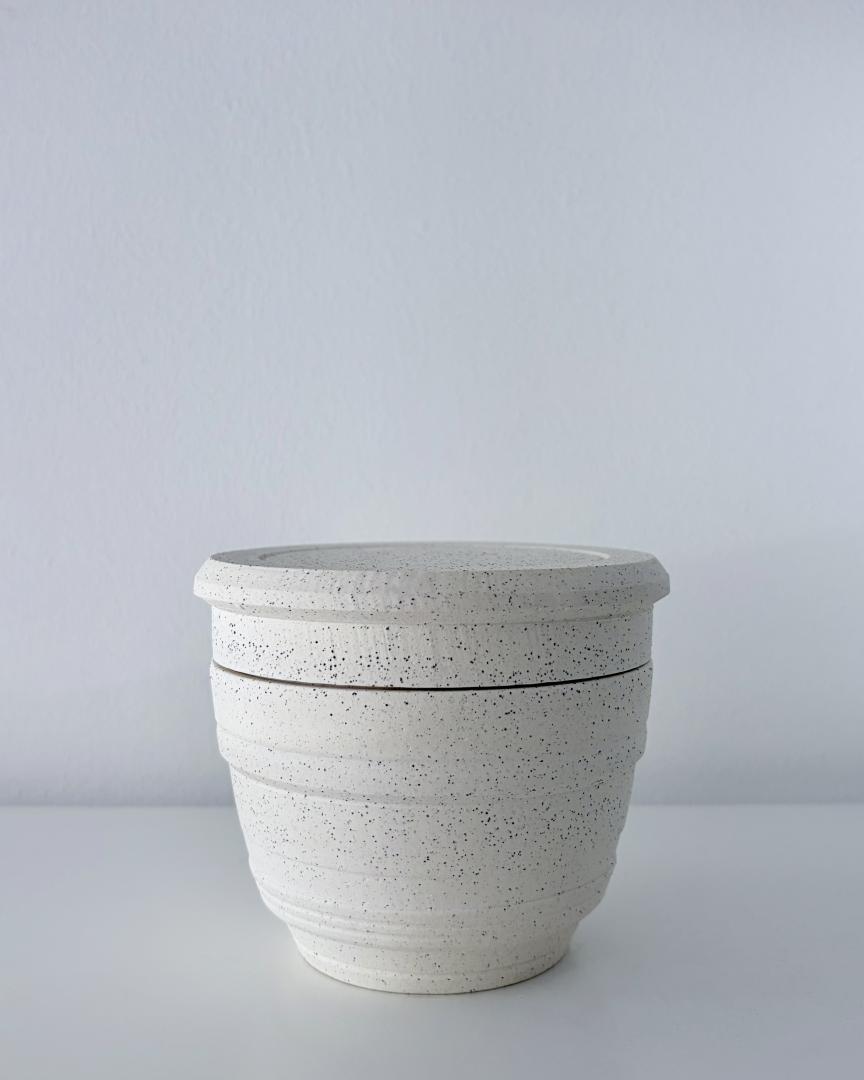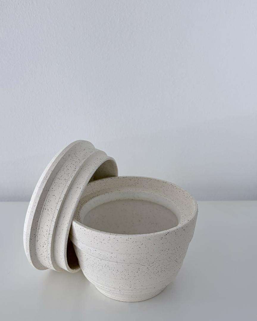 Lidded jar – Height: 10 cm | Diameter: 12 cm – Keane stoneware 7 speckled glazed inside in satin white.